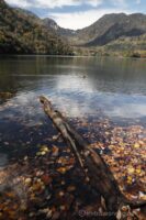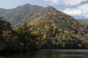 湯ノ湖の湖畔に下りると、流木や落ち葉が落ちる湯ノ湖の向こうに紅葉した山が連なりなんかいい感じ。