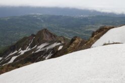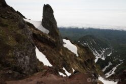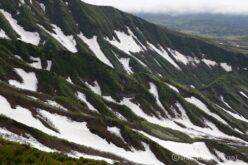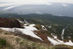 山頂から谷はまだ多くの雪が残り、綺麗なゼブラ模様となっている。緑一色の山よりも、雪渓のアクセントがあった方が綺麗だ。残念ながら山頂では雲が優勢で日が差さなかった。眼下には裾野と海しかない。見渡す限りの水平線は丸いのだ。地球の丸さをこれほど感じさせてくれる山は、日本では利尻岳が一番なのではないだろうか。