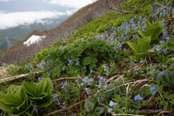 リュック荒らされ騒動も、犯人が分かってひとまず落ち着きを取り戻す。下りは早く下りれると踏んで、稜線のお花畑で花撮影にいそしむ。この青い花、いったい何なんだろうなぁ~。北海道の山と言えども、利尻岳以外では見たことがない。バイケイソウの新緑の間に青いお花畑が広がる。利尻岳ならではの光景に、最北端の山の特別さを感じる。
