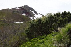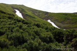 登頂するための許される時間がギリギリなので、休んでいられない。いつもよりペースを上げて進むが、幌尻岳とトムラウシ山と、ロングルートを日帰りで登ってきた後なので、疲れはピークに達している。思うように足が前に出ない。6号目上部からハイマツ帯になり、展望が開け始めてついに疲れて一休み。