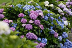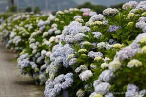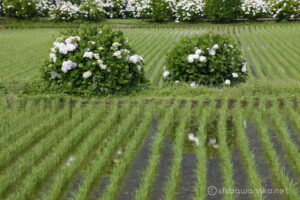 田園地帯に入ると、田んぼの畦道の両脇に綺麗なこんもりしたアジサイが植えられています。
