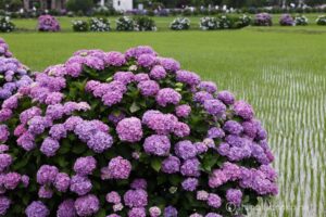 水の張られている田んぼと順調に生育している稲とアジサイの組み合わせ。