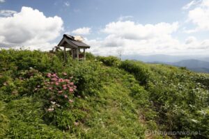 風が通る気持ち良い稜線を歩くと、小さな祠のある山頂に到着。