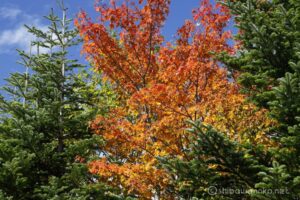 山頂には綺麗に紅葉した紅葉があり、一瞬晴れ間が出た青空をバックに輝いている。