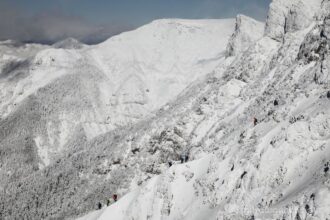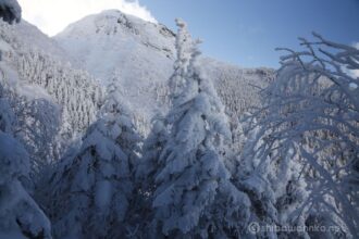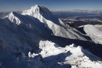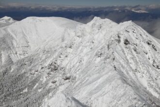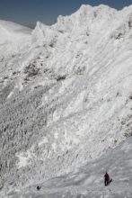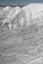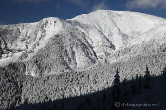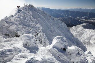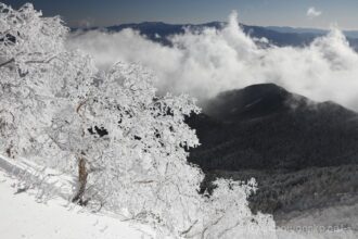 降雪直後でたっぷり雪があるうえ朝方まで雲が稜線上を覆っていたため、稜線全体が樹氷に覆われている。
