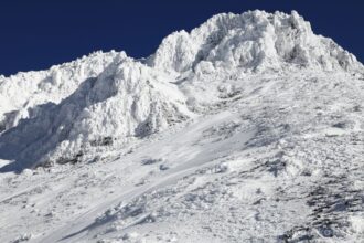 阿弥陀岳には雪煙から姿を現し、日が当たり輝き始める。