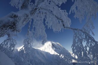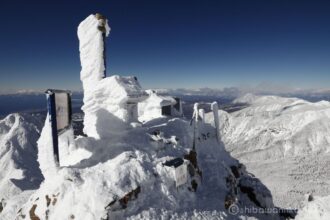 山頂で手の感覚がなくなりながらも写真を撮り終え、鼻水を凍らせながら文三郎道方面へ慎重に下る。