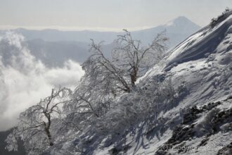 稜線を烈風に煽られながらも歩いていくと、樹氷越しに富士山が見え始める。