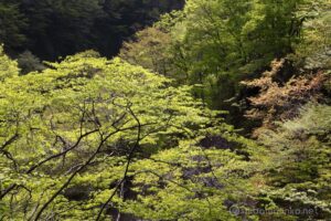 大山の山頂はまだ多くの雪を残している一方、山麓は新緑に覆われて眩しいばかり。