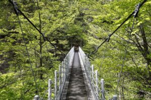 新緑の中、吊橋を渡ったり森の中を歩いたり。