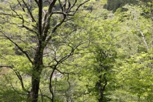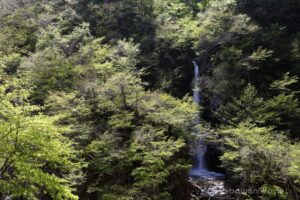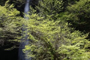 淡い新緑の向こうに大山滝が、2段42mの落差で大量の水を落としている。