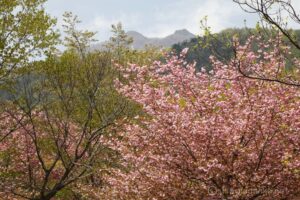 新緑の中に満開の桜も混じり、晴天の中美しい。