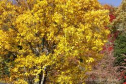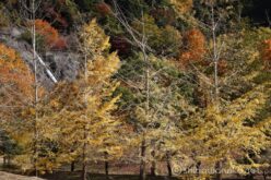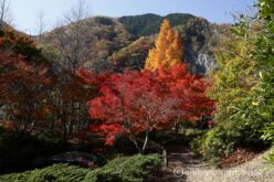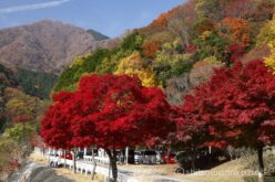 真っ赤な木の奥にはまっ黄色の巨木。その奥には紅葉の山肌が続く。