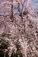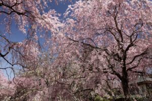 見上げると青空をバックに桜が枝垂れ桜が空から降ってくるよう。
