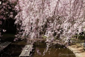 公園内には池もあり、枝垂れ桜が池に入りそうなほど覆い被さっている。