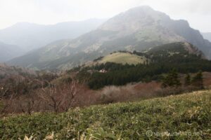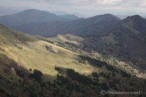 山頂からはさえない曇り空の下に一面の笹原が広がります。