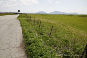 高原大地を走る1本の車道の奥には聳え立つような九重連山。