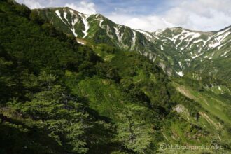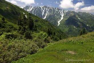 木々の緑と雪渓の白のコントラストが美しい。