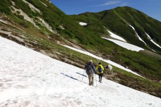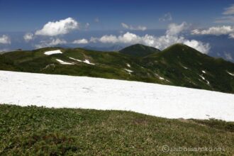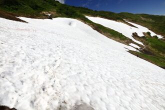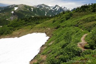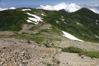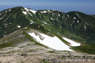 雪倉岳までは多少のアップダウンを繰り返しながら、時には雪渓を横断しながらの縦走路です。