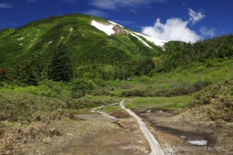 雪渓が多く残る脇に湿原が広がり、1本の木道が延びる。