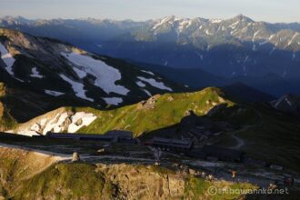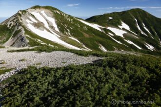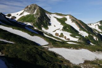朝焼けも綺麗ですが、通常の光の方が草木の緑と雪渓の白が綺麗に見えます。