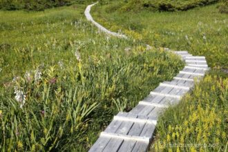 木道を進むと、木道はお花の小道。