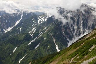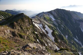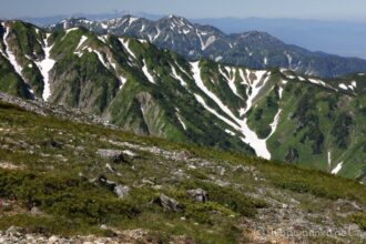 雪渓が残るゼブラ模様の稜線の奥には剱岳と立山連峰も見え始めました。