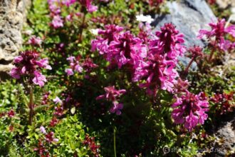 徹夜で900mの標高差を上げて疲労困憊にもかかわらず、暫しの間、灼熱の中お花畑と戯れる。