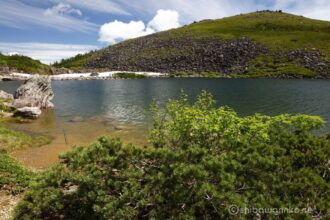 登山道から白馬大池を見下ろしても、お花畑と大池と雪渓が美しい。
