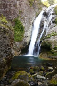 駐車場から10分くらい山道を歩くと、落差38mの鈴ヶ滝(小滝)が現れます。