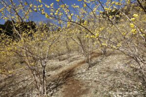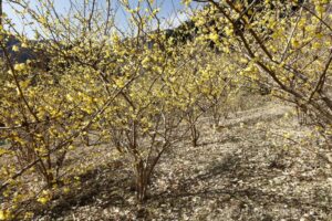 そこから茶畑の急な上り坂を10分程歩くとろう梅園に到着。