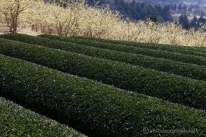 一番上まで行くと黄色いろう梅の重なりと茶畑を見渡すことができる。