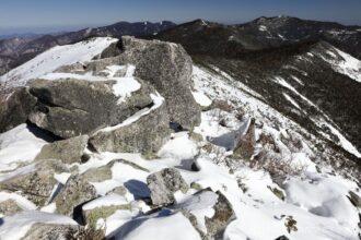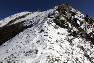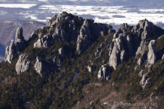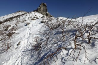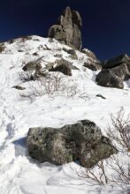 弁当箱が刺さったかのような五丈岩が見え始めることになり、ようやく稜線に雪が現れる。