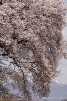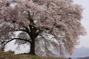 桜から南側の田んぼの中に桜を見る場所が設けられており、そこから少し離れてわに塚の桜を見ると、ちょうど桜の右側に八ヶ岳連峰が入る定番のシーンが撮れます。