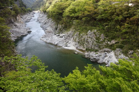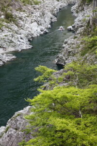 日が傾いて渓谷内は日陰になってしまいましたが、新緑と白い荒々しい岸壁と青い吉野川の組み合わせが綺麗。