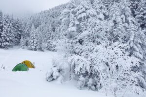 凍り付く行者小屋で朝食を取り準備を整え、地蔵尾根に取り付く。