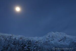 行者小屋まで下りると、満月が八ヶ岳を明るく照らし始めていました。