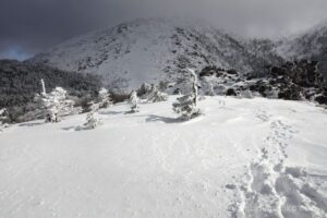 ここだーっと狙いに狙って天狗岳へ向かったものの、「降雪直後の晴れ」どころか雪が舞う始末。