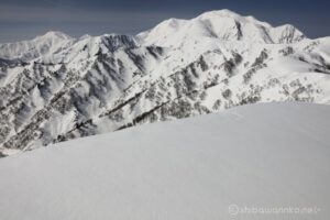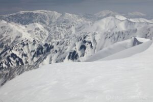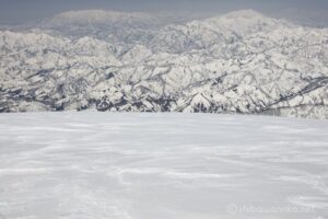 越後駒ヶ岳の広大な雪原の頂上から、上越国境の山々が連なる。
