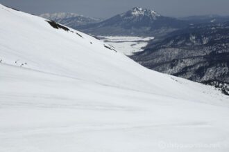至仏山山頂から山ノ鼻方面へ行くと、一面の雪原となっている尾瀬ヶ原とその奥に燧ヶ岳が聳える。