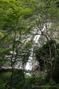 新緑の日陰になってお客さんがくつろいでいる布引茶屋から急坂を下ると、まもなく新緑に包まれた布引滝が姿を現してくる。