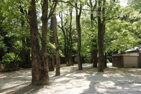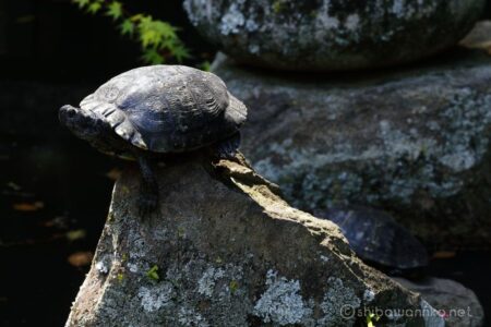 境内にある池では、差し込む光を求めて亀が浮島での甲羅干しに余念がない。