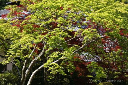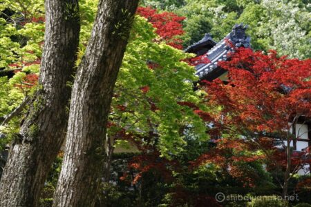 徳光院の本堂と多宝塔の周辺は赤と緑の新緑が混ざって美しい。