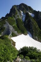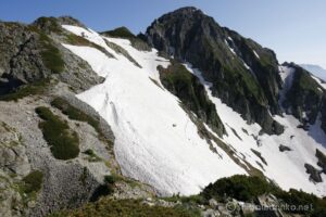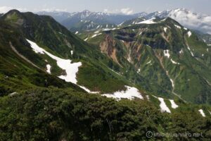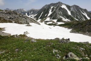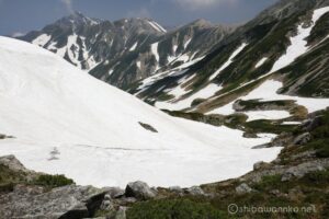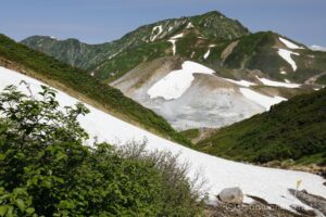 山の緑に雪渓の白のコントラストが映える、雪渓が多く残る早めの時期を選択。