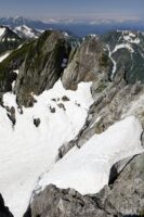 登ってきた反対側を見やると、剱御前の稜線上には広大な白い雪渓が広がっている。