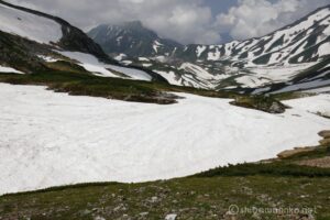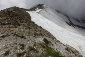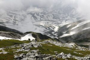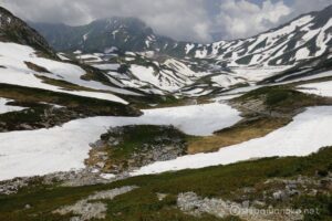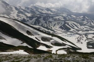 室堂山展望台まで標高を上げていくと、まだまだ融け切らない雪渓が点在します。