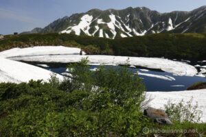 雪が溶けた部分は深いダークブルーで、その表面には立山や浄土山を映し込んでいる。