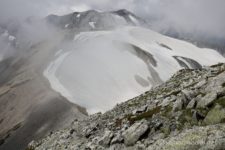 登ってきた反対側を見やると、剱御前の稜線上には広大な白い雪渓が広がっている。