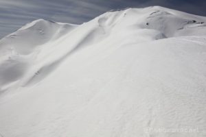 ヒールリフターを効かせてさらに登って行くと、既にスキーヤーが滑り下りてくるところだった。
