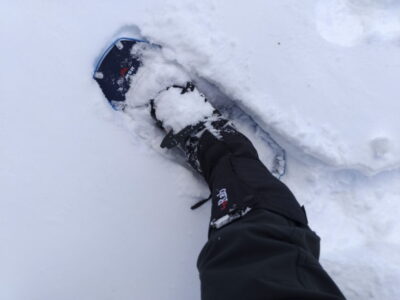 登山口から10cmくらいの沈み込みで、上部に行けば大変なことになるはず...、ということで車に戻ってスノーシュースタート。